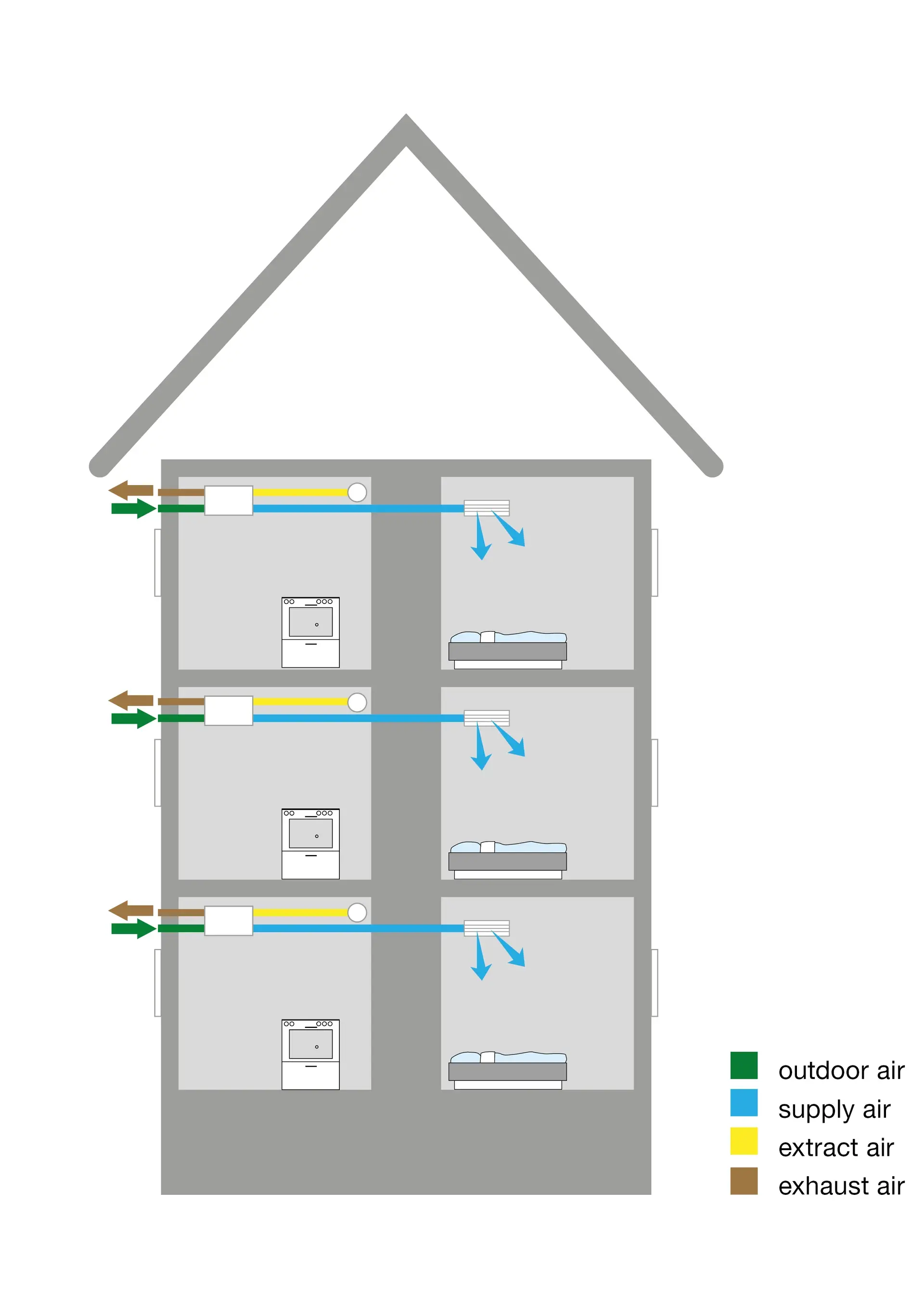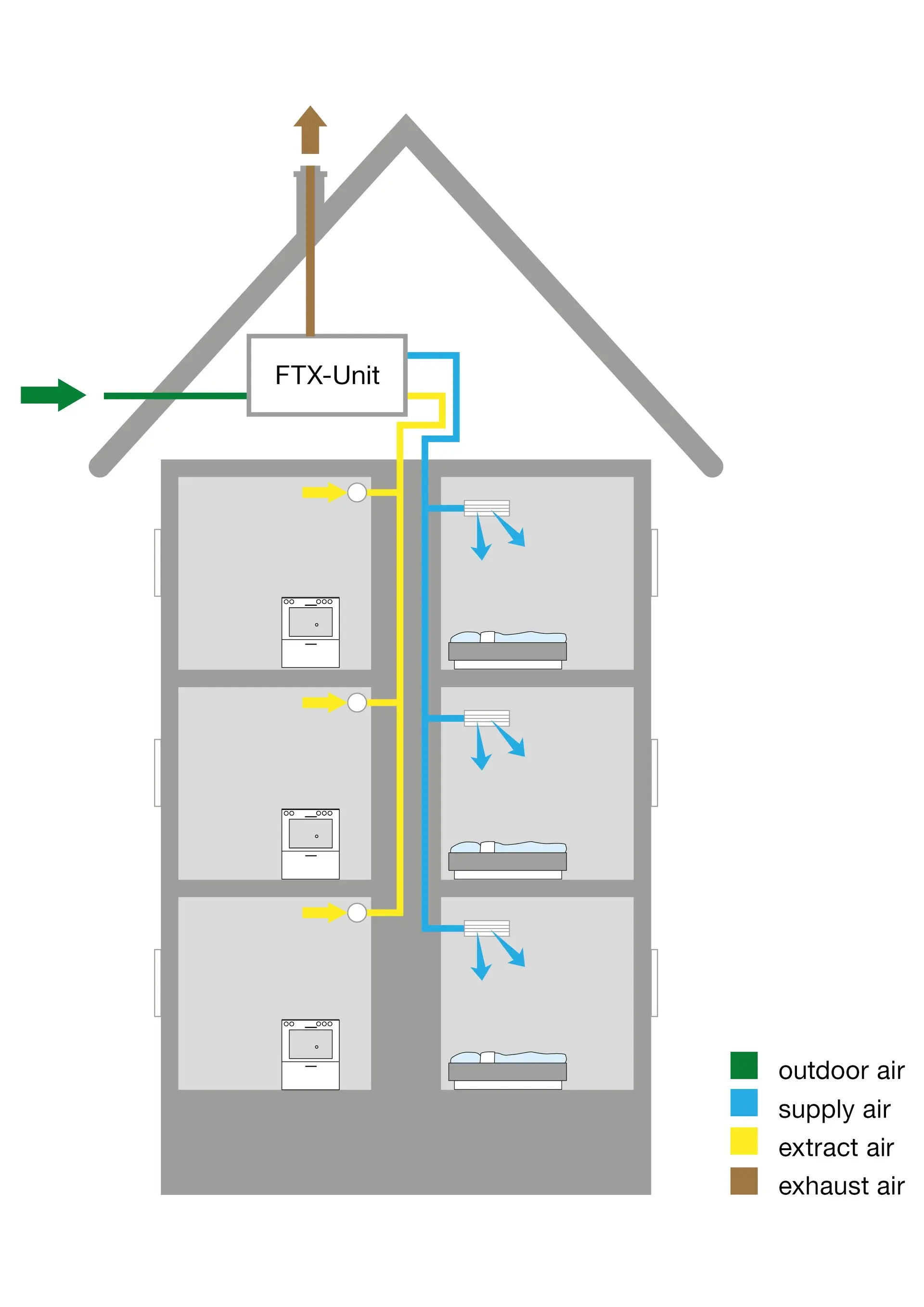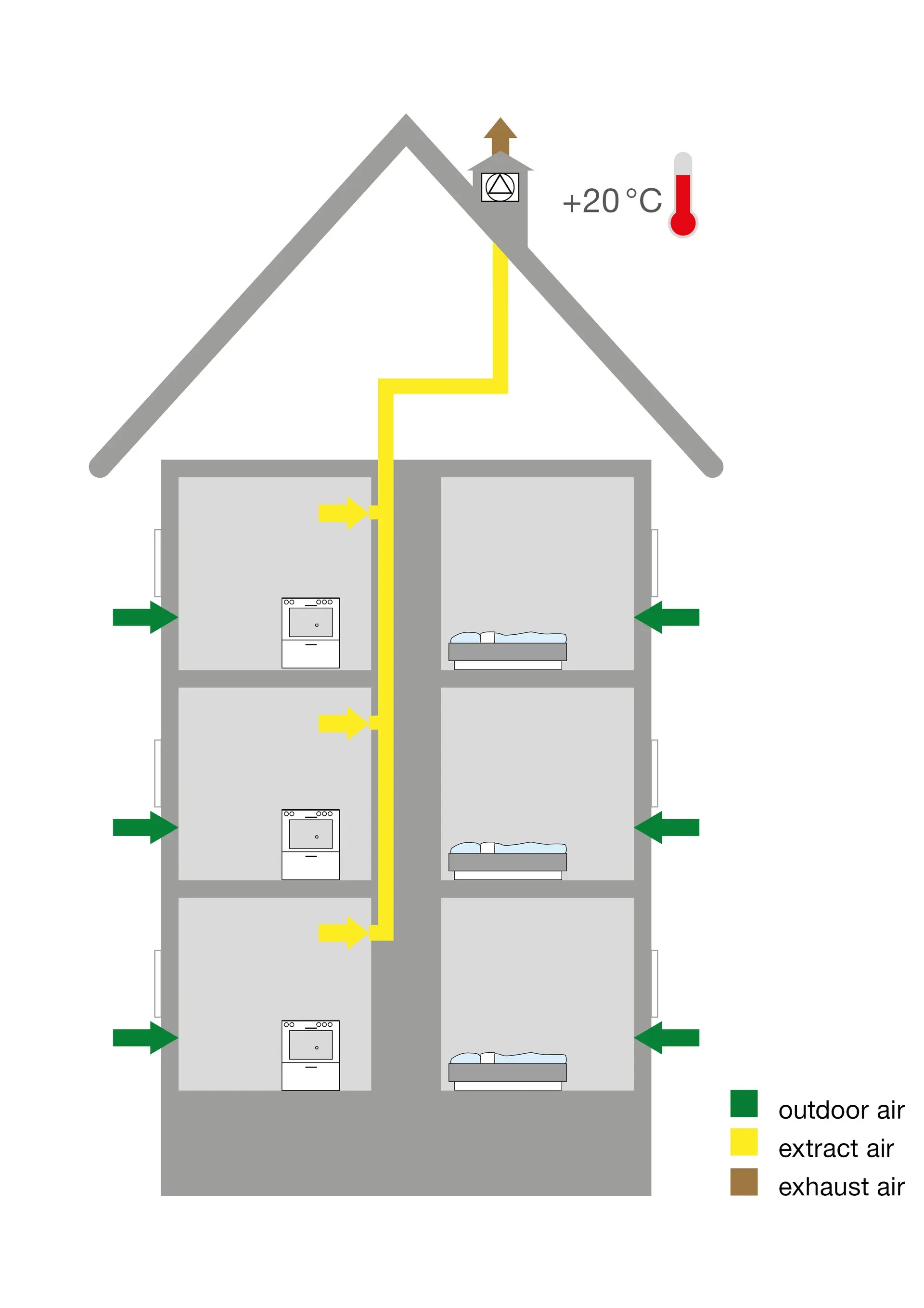 Friskluft tas inn via spalteventiler i vinduskarmene. Fraluften tas ut gjennom ventiler i baderom og kjøkken. Varmen i dette systemet gjenvinnes ikke. Den går rett ut via en avtrekksvifte.
